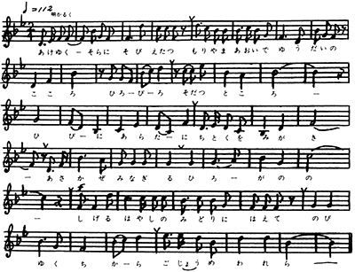 明けゆく空にそびえ立つ森山仰いで雄大の 心広々育つところ 日々に新たに知徳を磨き 朝風みなぎる広が野の 茂る林の緑に映えて 伸びゆく力 五城目われら